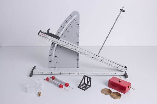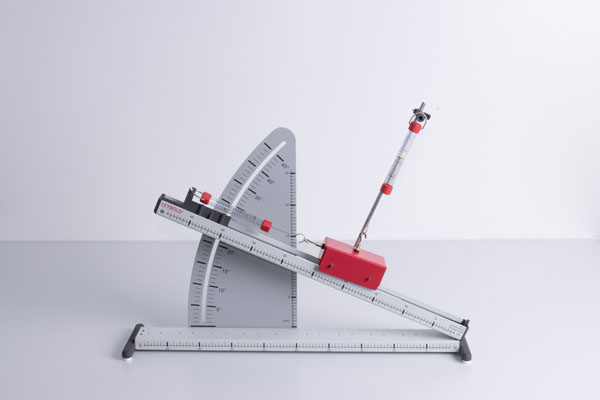 Kräftezerlegung: Messung von Normalkraft und Hangabtriebskraft gleichzeitig möglich. Mit verschiebbarer Aufhängevorrichtung für die Kraftmesser, sodass die Kraft am Kraftmesser komfortabel abgelesen werden kann.